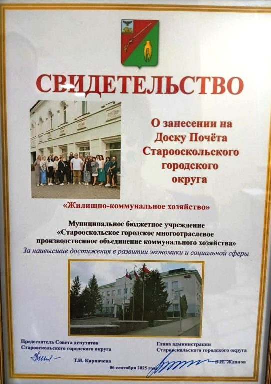 4 сентября 2025 г, состоялось торжественное заседание Совета депутатов Старооскольского городского округа, на котором состоялось вручение свидетельств о занесении коллективов на Доску почета.